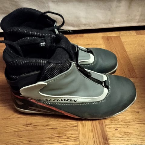 Pjäxor för längdskidåkning. Ganska dina utöver kardborrespännet där lite trådar lossnat och ludd. Litet märke på tån.