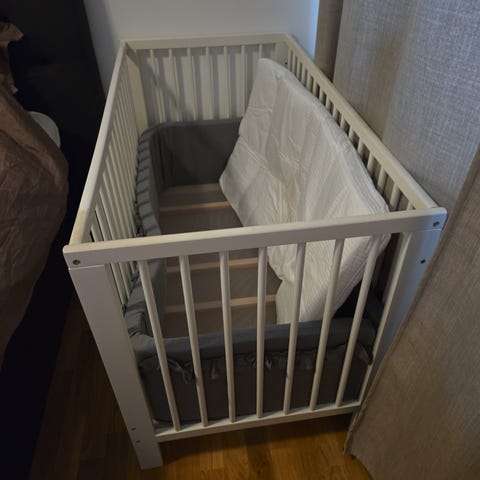 Den fungerar utmärkt som spälsäng i två lägen, högre för liten bebis och nedsänkt som på bilden för större bebis. Den går inte längre att montera isär eller att ta av ena sidan pga monrerad för många gånger för gängorna. Mobilen som spelar musik, spjälskyddet och något lakan ingår!