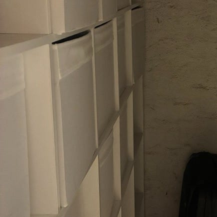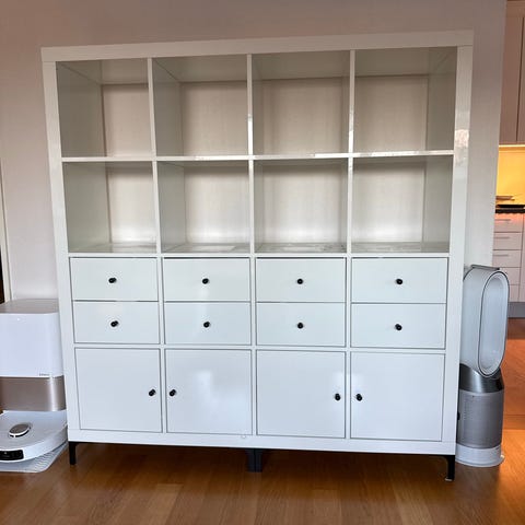 Kallax hylla 4x4 med 4 rosa lådor. Ca 150x150 cm. Finns två st. 300 kr/st