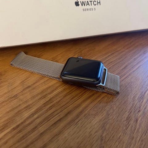 Apple Watch Series 3 i svart, batterikapacitet på 86%. Boett storlek 38.