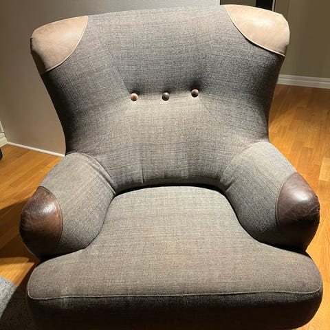 Skruttig med skön fotölj säljes. Finns en liten fotpall till. Fotöljen behöver en del fix, tyget är slitet, men det är inga hål.