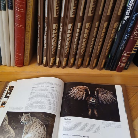 Många böcker i varierande skick: några är nya och olästa, andra har trasig pärm, tror ingen är skriven i om jag inte nämnt det.