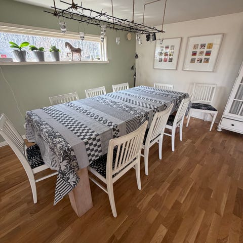 Bordet är mycket flexibelt. I stort sett kvadratisk bordsskiva i ek, 98 x 90 cm, och när man vill duka för fler personer kan man använda de två utdragbara skivorna och bordet blir då 180 cm. Givetvis kan man välja att bara dra ut den ena skivan. Inga reparationer eller lagningar på bordet, men det är några repor i de utdragbara skivorna. Avsikten med de två skivorna är, som är i ett annat utförande än själva bordsskivan, är att man ska (kan) använda en bordsduk när man ska "finduka". Upp till ett tiotal personer får plats vid bordet med de två skivorna på plats.