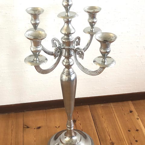 Säljer en stilren 7-armad golvljusstake i silverfärgad aluminium. Ger ett exklusivt och klassiskt intryck – perfekt som dekoration i vardagsrum, hall, butik, event eller vid festliga tillfällen.