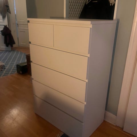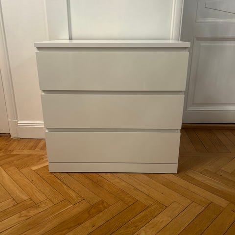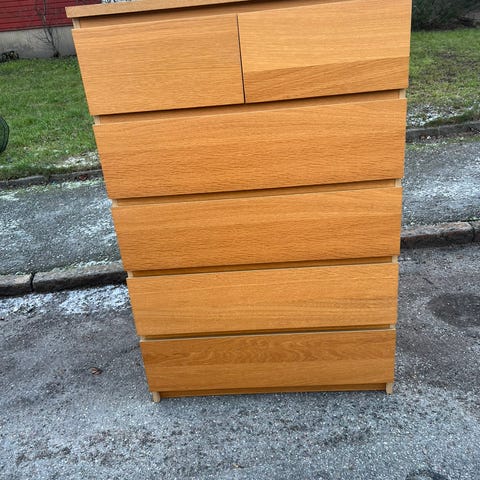 2 Malm-byråer i ekfaner med 4 lådor. Båda är använda och visar slitage (se bilder) men är fullt fungerande. En med fläckar på ovansidan, lätt att maskera, säljs för lägre pris.