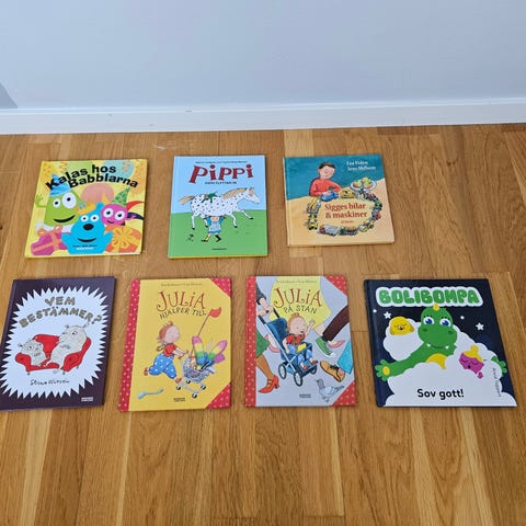 En samling av barnböcker med varierande titlar och författare. Böckerna har olika storlekar och färger, och är avsedda för barnläsning. Innehåller illustrationer och berättelser lämpade för yngre läsare.