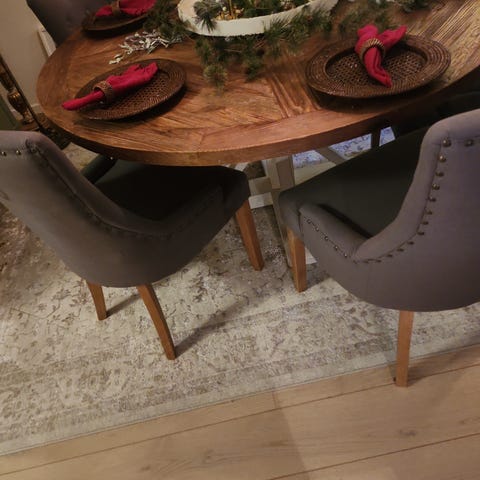 Ett runt köksbord med tillhörande 4 stolar från IKEA, serien LISABO inklusive ÄLVGRÄSMAL stolsdynor.