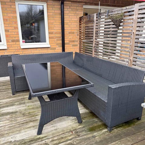 Loungemöbel. Hörnsoffa plats för 5-6 personer samt bord med glas (trademax). Konstrotting. Svarta dynöverdrag. Finns en hel uppsättning dynöverdrag även i vitt som är helt oanvänt. Ingår även ett regnskydd som dynorna kan förvaras under (Dryboy) som är special beställt.