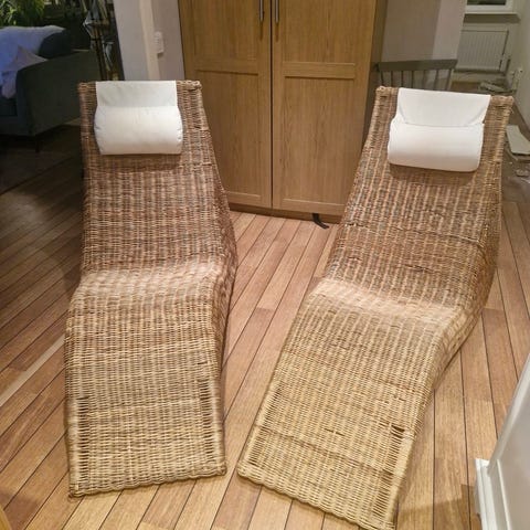 2 st solsängar/ vilfåtöljer i handgjord rotting i mycket gott skick. Fåtöljen är designad av Karl Malmvall för IKEA. Fungerar lika bra inne som ute, dessa har bara varit inomhus. Dessa Vintagefåtöljer tillverkas inte längre och är mycket sköna att sitta i. Den ena har en nackkudde. Säljes pga flytt, finns i Bromma. Pris med nackkudde 1500:-, utan nackkudde 1200:-, paketpris 2500:-