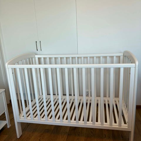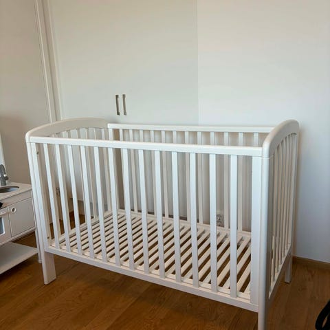 Troll spjälsäng i vit färg. Höj och sänkbar sida med totalt tre lägen möjliga på själva bädden.