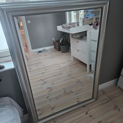 IKEA Levanger spegel med en ram i silverfärgad finish. Spegeln har en rektangulär form och kan användas som väggdekoration i olika rum.
