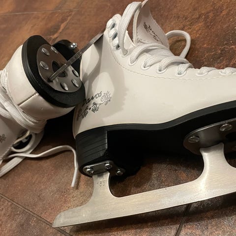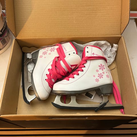 Barnskridskor i storlek 27-30 med vit och lila design. Passar för olika typer av skridskosporter.
