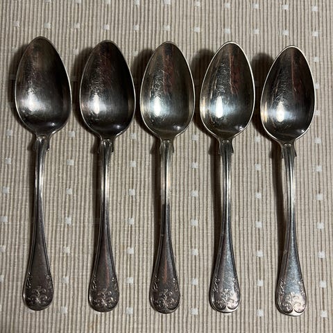 Prima N.S. bestickset tillverkat i silver. Setet innehåller olika typer av bestick inklusive skedar, gafflar och knivar med detaljerade mönster på skaften.