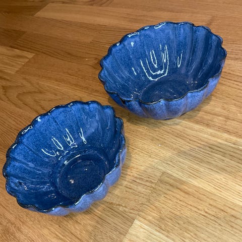 Tre mindre skålar (ca 16 cm) och en stor skål (ca 27 cm lång, 22 cm bred). De mindre skålarna har lite smårepor, den stora är i toppenskick.