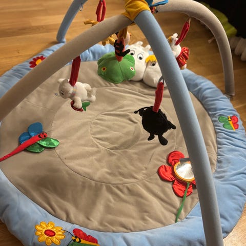 Mumin lekmatta för barn med mjuk dyna och hängande figurer i olika färger. Utformad för att stimulera barnets sinnen och motorik under lek. Passar för små barn och spädbarn.