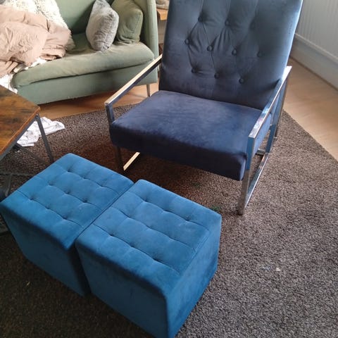 Grön plastfåtölj med svart dyna och bra förvaring.