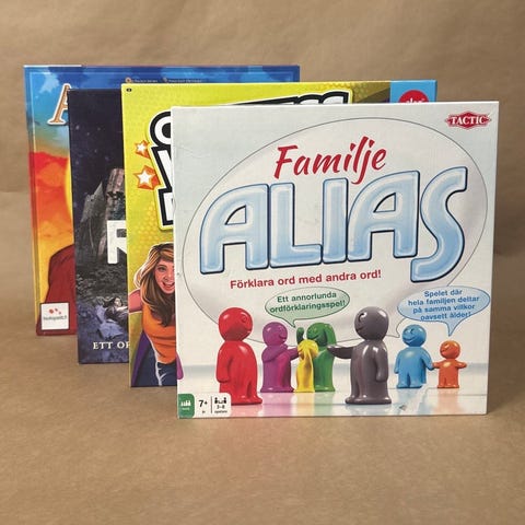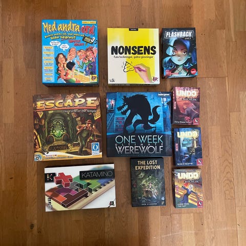 Totalt 12 stycken populära brädspel varav vissa är helt oöppnade (Codenames Disney och Dilemma). De spel som är använda är kompletta och i utmärkt skick.