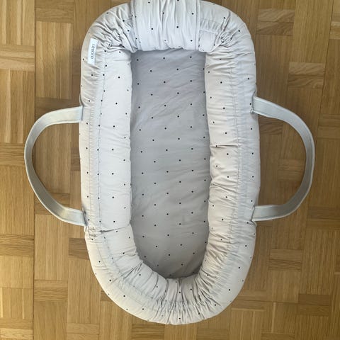 Vit babynest med svarta prickar säljes. Uppskattades mycket av vår bebis. Är synligt använd med lite fläckar här och där men är fortfarande väldigt skön och fin!