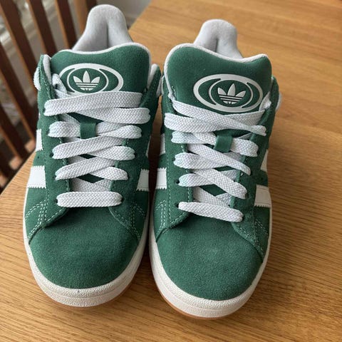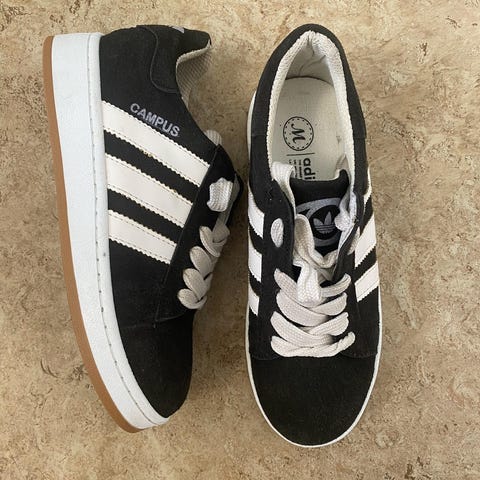 Adidas Campus Sneakers i storlek 36 med grå färg och vit sula. Skorna har klassisk design med tre vita ränder på sidan och är tillverkade i material som ger en sportig och avslappnad stil.