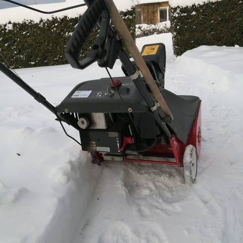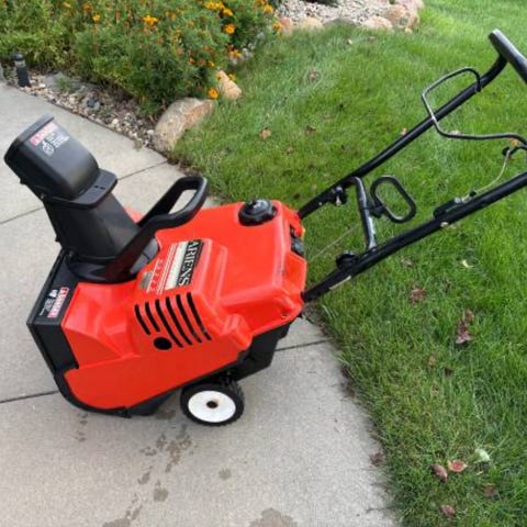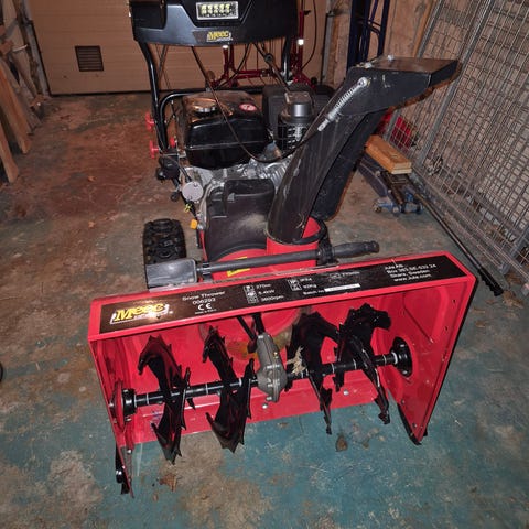De grovmönstrade hjulen med diameter 330 mm ger bra grepp i snön. Snöslungan har en bensindriven 180 cc 4-taktsmotor med dragsnöre och primer.