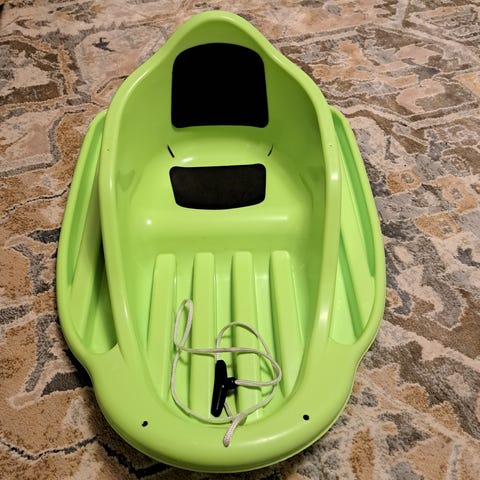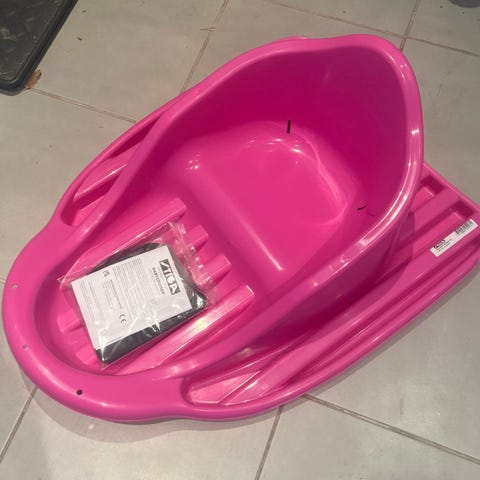 Stiga pulka i svart färg. Tillverkad av plastmaterial, utformad för barn. Utrustad med snöre fram och remmen saknas
