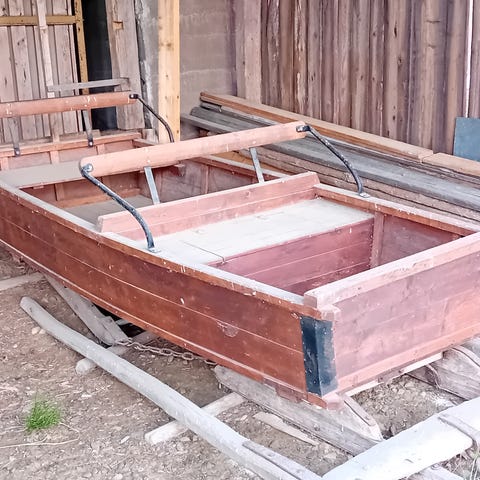 Gammal släde i användbart skick. Körde med ardenner och nordsvensk. Skacklar medföljer. Finns utanför Arboga.