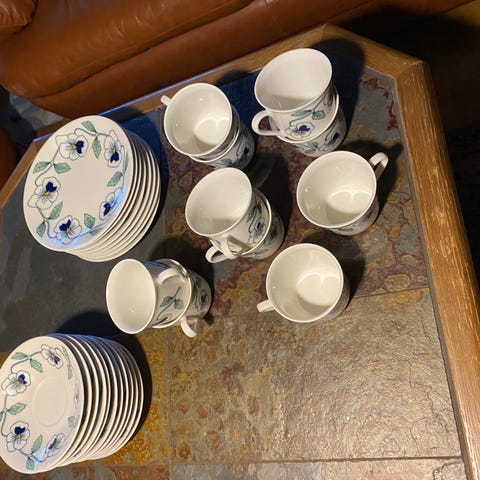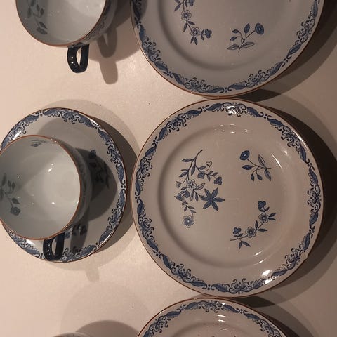 Rörstrand servis i blått porslin bestående av 8 tallrikar (27 cm), 8 assietter (21 cm), 7 skålar och 8 muggar. Nypris ca 8 000kr.