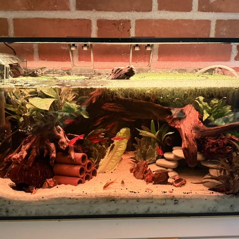 Akvarium på 50L med vatten termostat och filter pump. Perfekt för dig som vill testa på att skaffa akvarium! Termostat och pump är nästan helt nya.