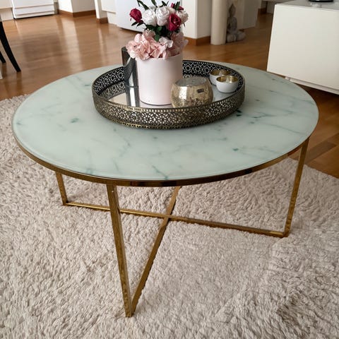 Soffbord i marmormönster, 80x80cm. Hämtas på Kvarngärdet.