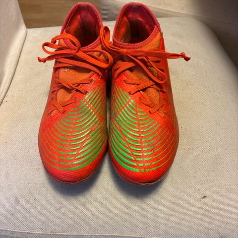 Adidas Predator fotbollsskor i svart och rosa färg. Skorna är storlek 38 2/3och har dobbar för spel på gräsytor. Rödsvarta pumaskor storlek 31, vitsvarta inneskor adidas storlek 35 1/3, inomhus nikeskor storlek 35