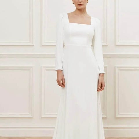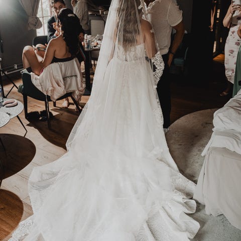 Använd på sommarbröllop 2025. Justerad hos skräddare som bl.a. satte hållare/ögla i kjolen för att kunna bära och dansa med släpet (se bild). Kemtvättad. Litet hål i chiffongen i kjolen som behöver dras ihop, annars hel och ren.
