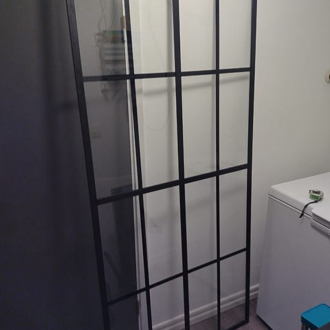 Detta är en hel Duschvägg med två glasdörrar dörrar som ligger i en skena så dörrarna glider åt sidan och med handtag i metall.