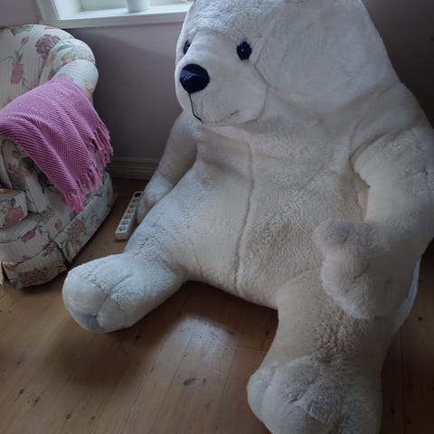 Stoy gungbjörn i fint begagnat skick. Finns 1 liten obehandlad fläck mitt på huvudet. Rökfritt hem. Finns en kanin i hemmet men hann fanns inte i hemmet när barnet använde den, stått på vinden i 3 år.