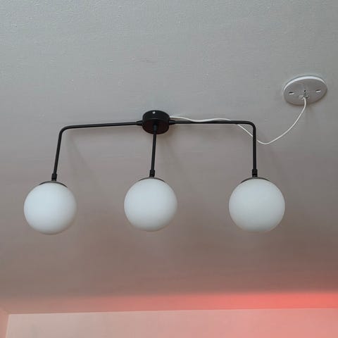 Mycket trevlig lampa med 2 ljuskällor, tyvärr för lågt i tak för att ha här hemma