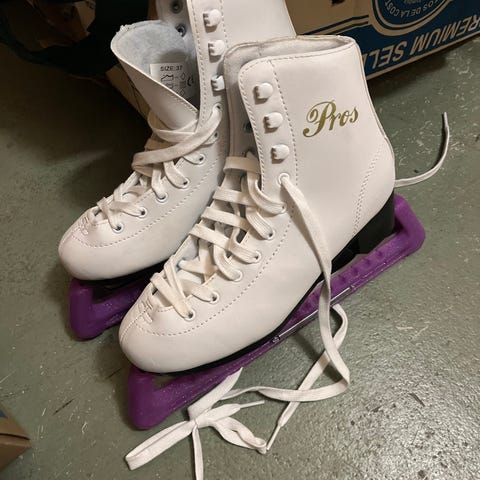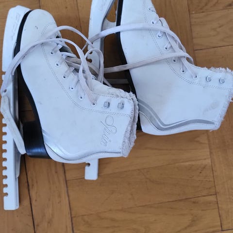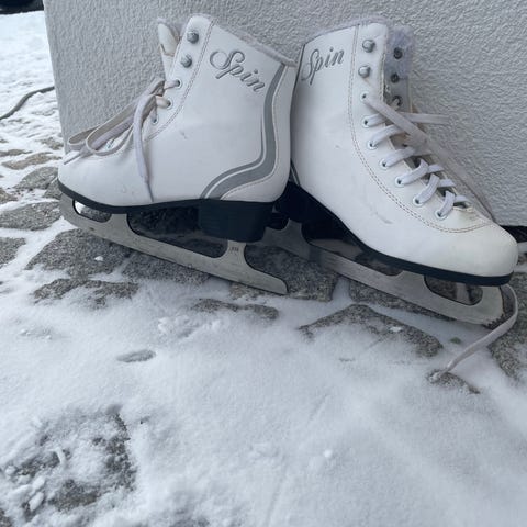 Spin skridskor i storlek 41, avsedda för övriga skridskosporter. Skorna är vita och har en klassisk design med snörning. Inkluderar även en svart hjälm med justerbara remmar för säker användning (55-58cm) vid skridskoåkning, samt en vacker tygförvaringspåse (från Bag All) till skridskorna.