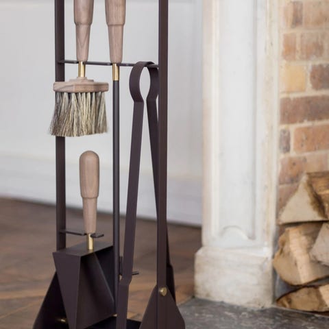 Eldset bestående av tre verktyg med handtag i metall och glasdetaljer. Designad för användning vid hantering av vedeldade eldstäder.