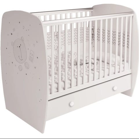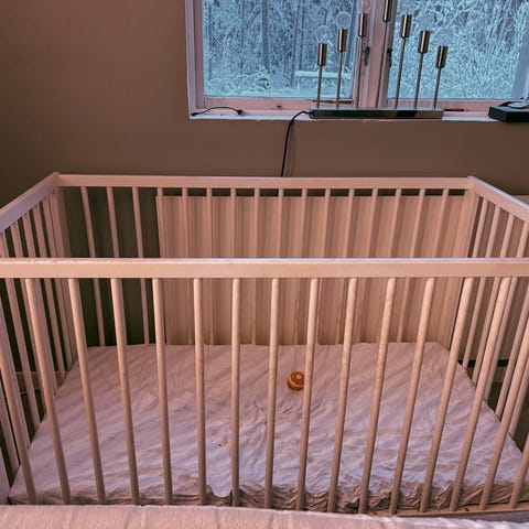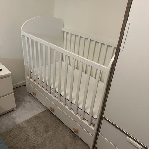 IKEA Spjälsäng i vit färg avsedd för barn. Tillverkad i trämaterial och utformad för att erbjuda en säker sovplats för spädbarn och småbarn. Sängen har spjälor runtom för ventilation och säkerhet.