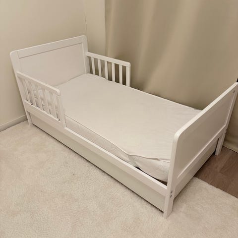 Sängstomme: Yttermått 169x86 cm. Utrustad med skyddsstängsel runt om och en praktisk förvaringslåda på hjul under sängen.