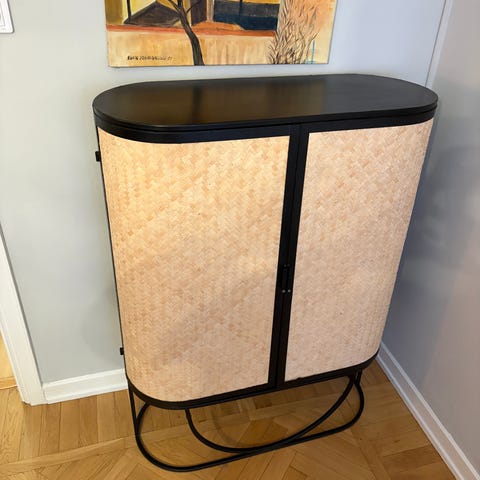 Säljer ett vitt fint serverings skåp med unika detaljer och en smart design. Skåpet går att plocka isär, då övre delen kan avlägsnas från den undre, vilket gör det lättare att flytta runt och använda. Skåpet är perfekt att ha i ett kök, vardagsrum eller i en matsal och kan användas i flera olika förvaringssyften.