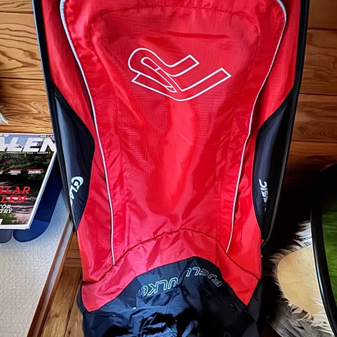 Säljes utan åkpåsar - originalpåsarna är enligt mig för tunna. Vi har kört ungarna i våra varmaste vintersovsäckar istället - i dessa har barnen varit varma och trygga i såväl hård vind som sträng kyla (-25 har inte varit några problem även med små barn).