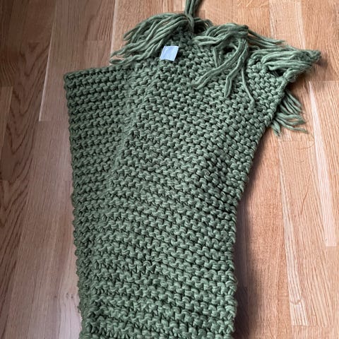 Hemstickad i regnbågens färger ungefär som en triangel ca 250cm lång och 60cm på bredaste stället. Mjukt och skönt akryl garn.