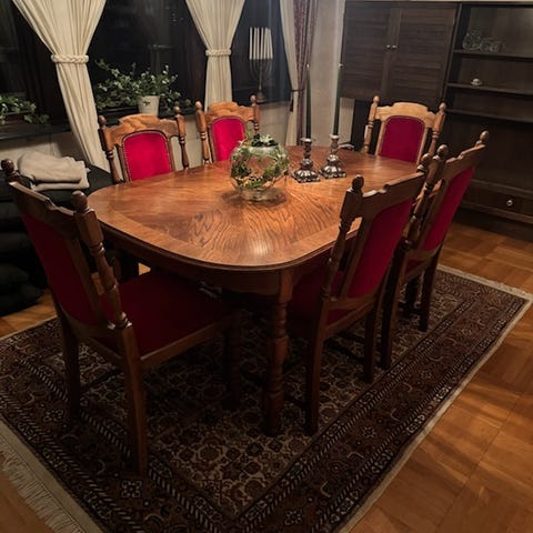 Bord med 6 stolar i konstläder. Finns en del klös-märken på stolarna då vi har katter i hemmet. Annars i fint skick.