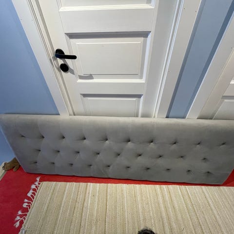 Säljer en snygg sänggavel i ljusbeige sammet, i nästan nyskick.
