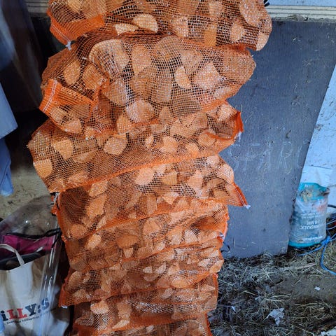 Veden är kapad och klyven i 30 cm längder och är packad i 60 l säckar och är torr. Blandved 70,- /säck.