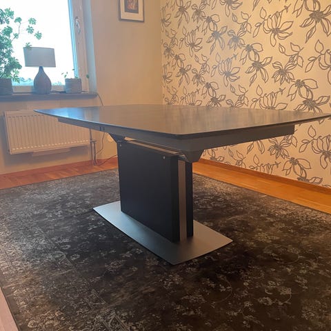 Fint matbord i svartbetsad ek från BoConcept. Iläggskiva i krom som ger en totallängd på 240 cm. Fot i borstad stål. Nypris ca 25000 kr. Finns några små skavanker se bilder.