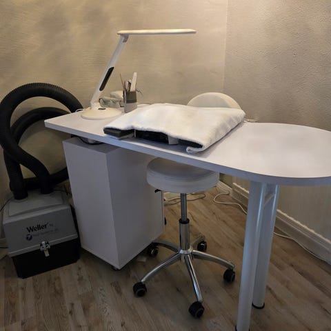 Stolen är fullt elektrisk och justeras enkelt med fotpedal, vilket gör den smidig att arbeta med under behandlingar. Klädseln är i slitstarkt och lättskött PU-läder i ljus färg. Mycket bra komfort för både kund och behandlare.