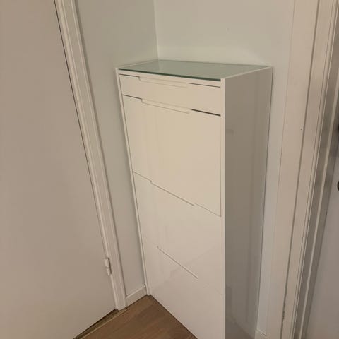 Säljer ett vitt skoskåp TERPET från JYSK i mycket fint skick. Stilren design som passar de flesta hallar. Skåpet har 2 skofack samt 2 praktiska lådor upptill för småförvaring.