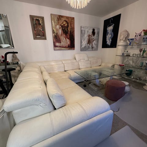 Vit skinnsoffa 250 cm med puff