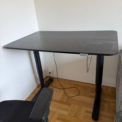 Ikea Bekant, höj- och sänkbart skrivbord, med motor. 160 X 110/60 cm. Sparsamt använt. Inköpt för fyra år sedan.