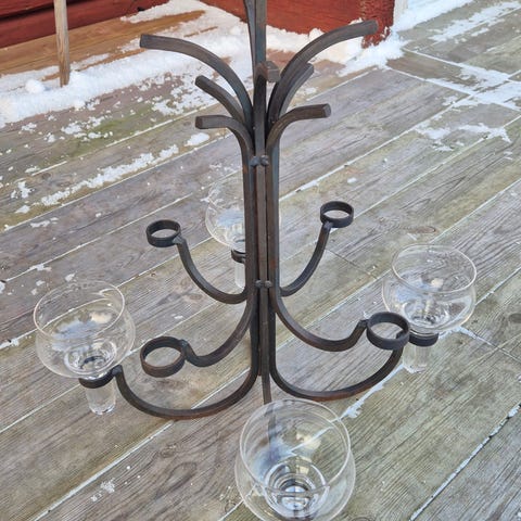 Taklampa med plats för 5 ljus. Infälld spotlampa under. Lampan har en kedja för upphängning.